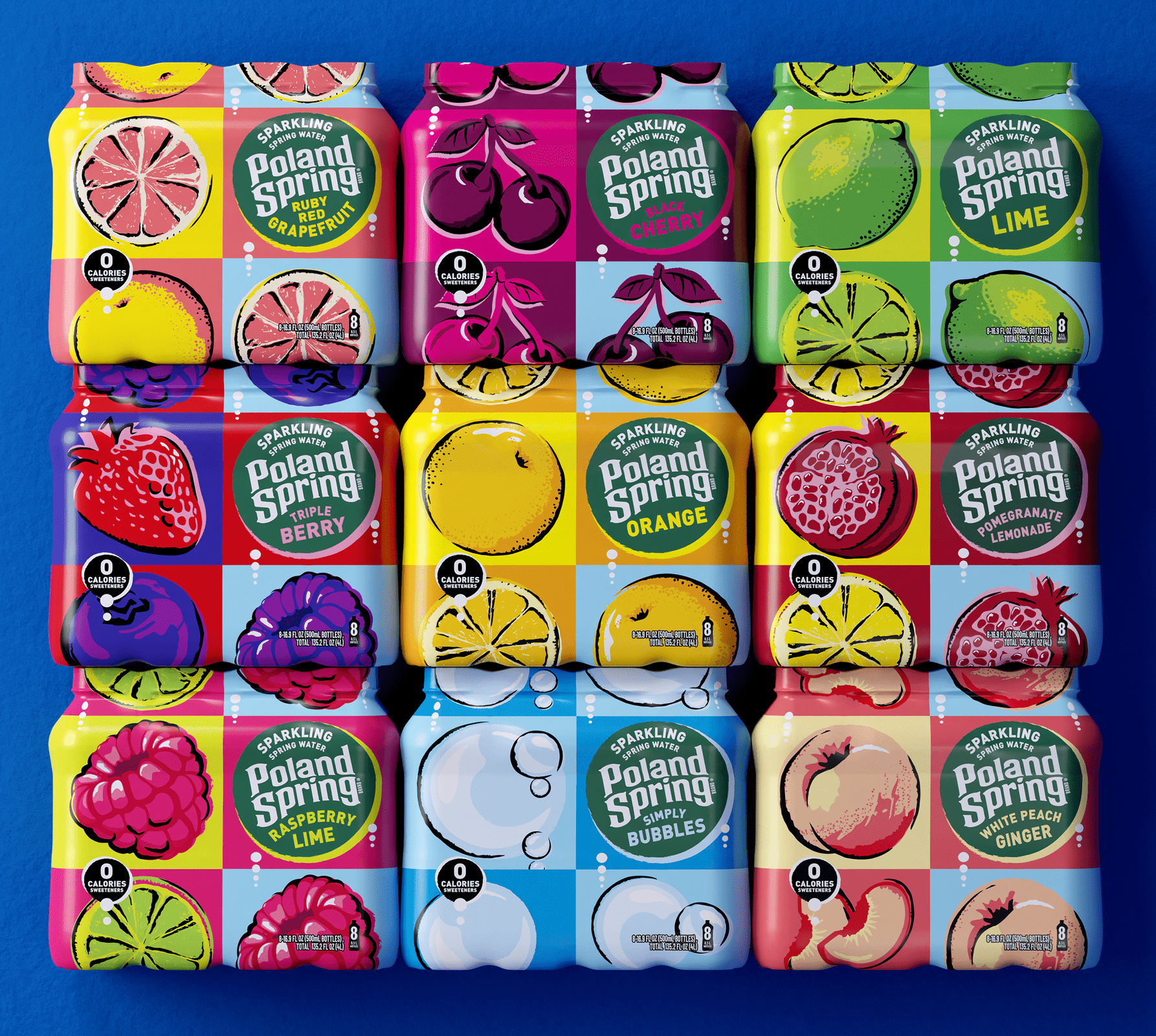 To stand out in a loud category we knew our design would have to be bold and colourful. But the question was – how could that colour be distinctive and ownable? The answer: make it iconic. Each pack design features Pop Art inspired flavour illustrations stamped with the famous Poland Spring badge. Classic credentials with a sparkling postmodern vibe.